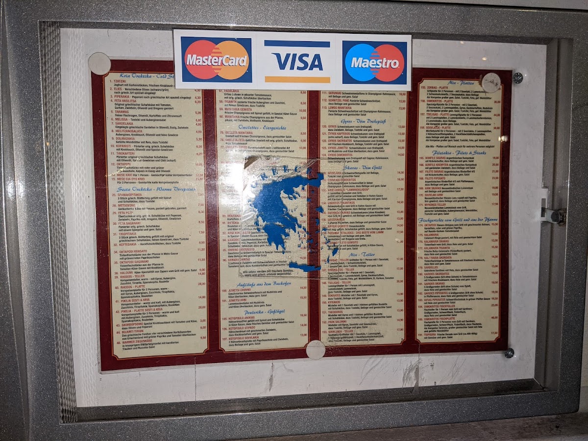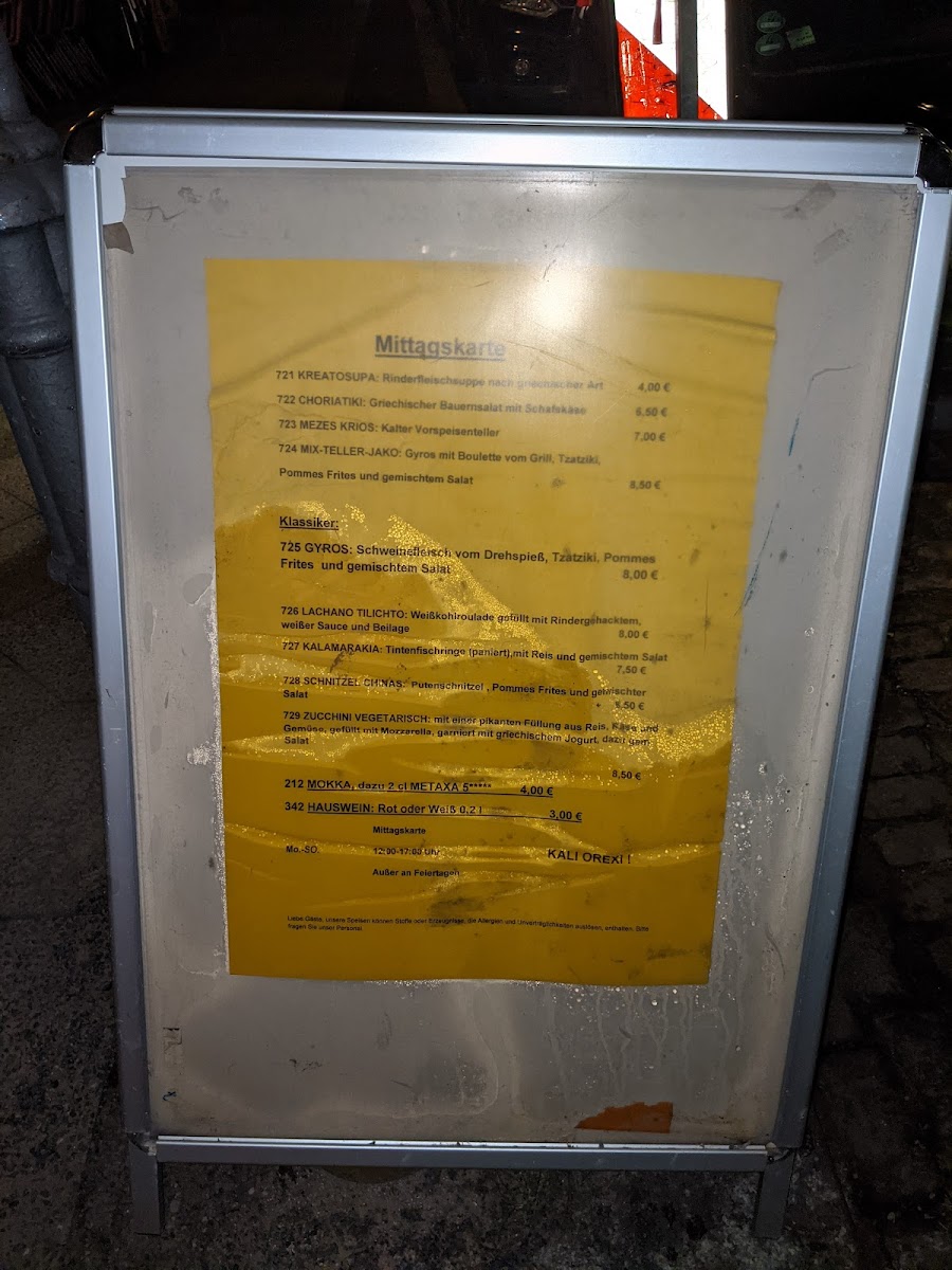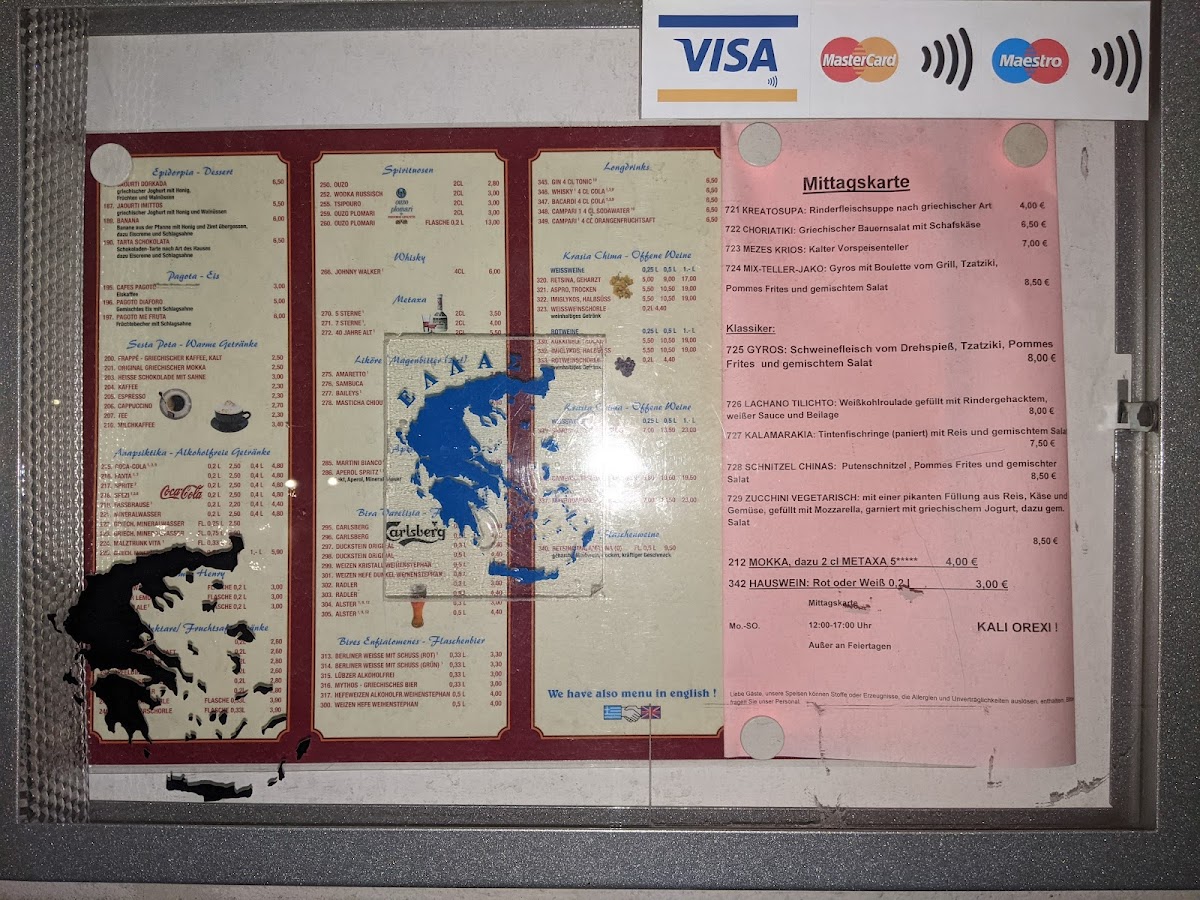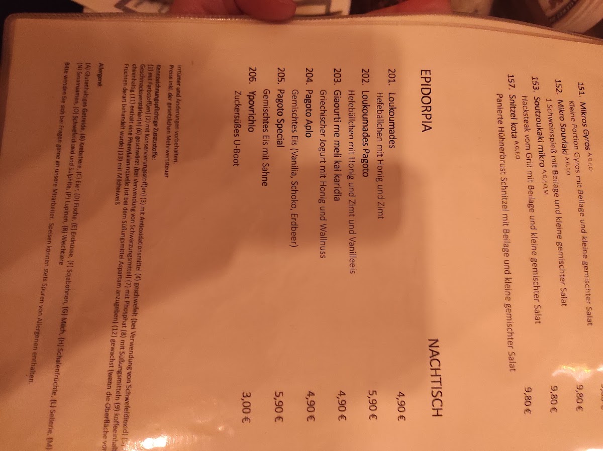 Taverna Restaurant Mastiha, located in the heart of Kreuzberg, Berlin, invites you on a delightful culinary journey through Greece. The menu highlights traditional Greek flavors, prominently featuring expertly grilled meats like the souvlaki and the breathtaking Bifteki gemisto, a giant hacksteak stuffed with sheep cheese, both beautifully paired with fresh salads and tzatziki for only €15.50.